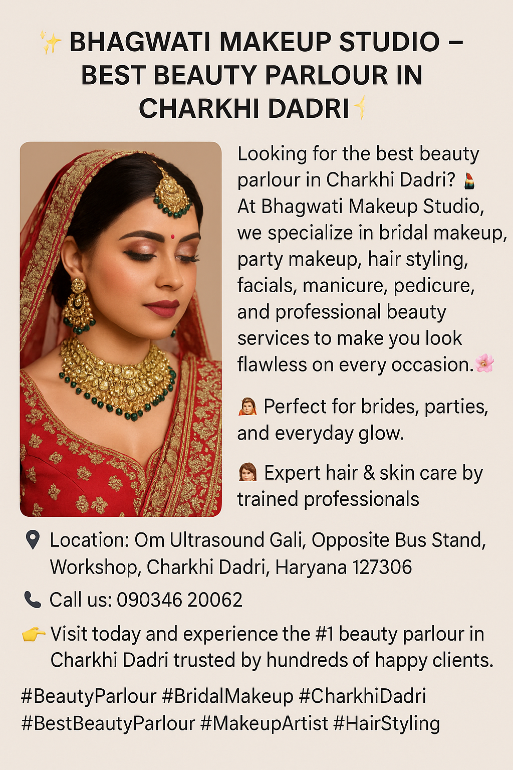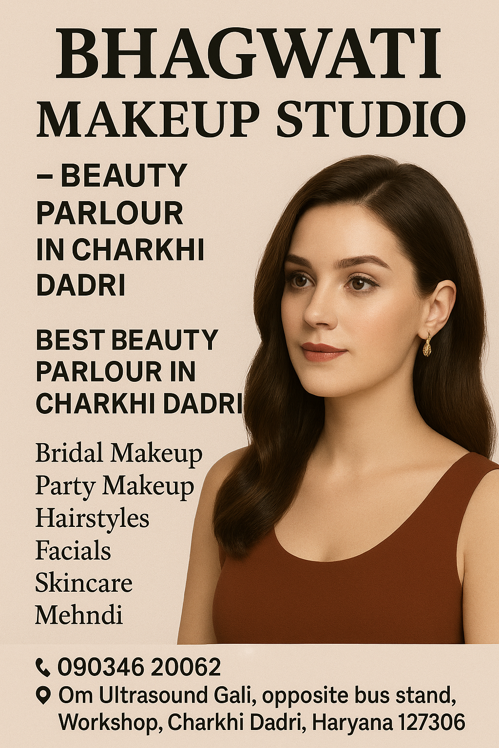 Bhagwati Makeup Studio – Best Beauty Parlour in Charkhi Dadri offers professional bridal makeup, HD bridal makeup, party makeup, reception makeup, engagement makeup, and glam makeovers. We are trusted as the top bridal makeup artist in Charkhi Dadri, providing services like hair styling, hair smoothing, keratin treatments, facials, nail art, mehndi design, and skin care. Recognized as a leading wedding makeup salon and beauty salon near me, we use premium brands like MAC, Kryolan, and L’Oréal for flawless results. Whether you search for beauty parlour near me, best beauty salon Charkhi Dadri, professional makeup artist near me, or top bridal makeup studio Charkhi Dadri, Bhagwati Makeup Studio is your trusted destination for beauty, quality,